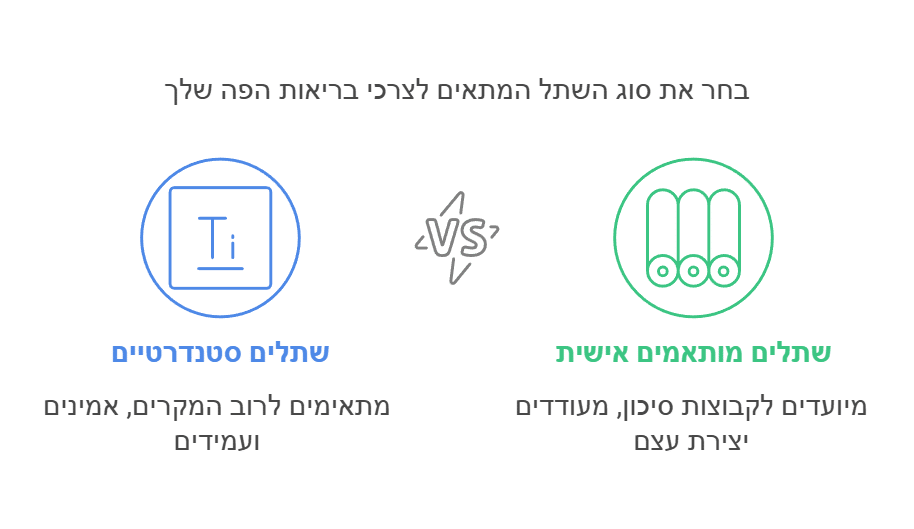 - שתלים מותאמים אישית – שתלים אלה מיועדים לקבוצות סיכון כמו מעשנים, חולי סוכרת ולוקים בדלדול עצם. הם מצופים בחומר מיוחד המעודד יצירת עצם נוספת.